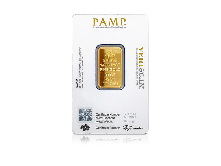 PAMP Suisse is one of the most popular brands of gold bars worldwide, and their value has increased, with added security through the new Veriscan---- technology that helps verify the bar's origin when purchasing on the secondary market.- - Contains 1/2 oz of .9999 fine gold.- - PAMP Suisse's exclusive Veriscan---- technology uses the metal's microscopic topography, similar to a fingerprint, to identify any registered product and assist in detecting counterfeits. Each bar is scanned during production and, when scanned by the customer, is further authenticated by the Veriscan---- database.- - Obverse: Features a popular design of Fortuna, the Roman goddess of fortune and luck.- - Reverse: Displays the weight, purity, and a unique serial number.