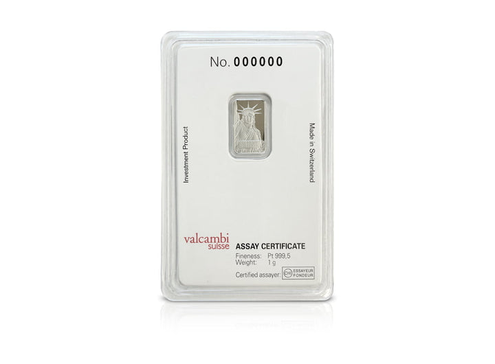 This brand new 1 Gram Platinum Bullion 999.5 bar is produced by Valcambi, one of Switzerland's main precious metals refineries, for Credit Suisse.