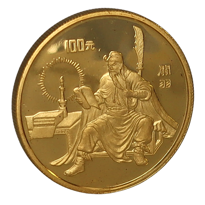 The 1995 1 oz Gold 100 Yuan Coin from the People's Republic of China features Guan Yu, a key figure from Romance of the Three Kingdoms, seated in a detailed design. Crafted from .999 pure gold, this 32mm coin weighs 31.1035 grams and has a reeded edge. It is part of a Classical Literature series with a mintage of only 1,500, making it highly collectible.