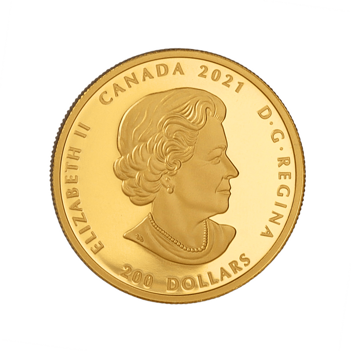 On the reverse side, Hunt's design showcases a shining sun surrounded by two pairs of engraved bighorn sheep (Ovis canadensis) one detailed with multiple finishes, the other enhanced with vibrant colors. A ring of triangular mountain peaks frames the battling rams, each adorned with symbolic crests: the eagle crest from Hunt â„¢s home village of Fort Rupert, B.C., on their backs, and the raven crest of his father on their hooves. The obverse features Susanna Blunt â„¢s effigy of Her Majesty Queen Elizabeth II.