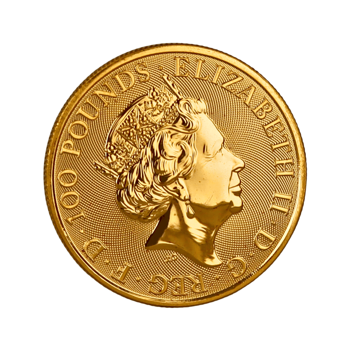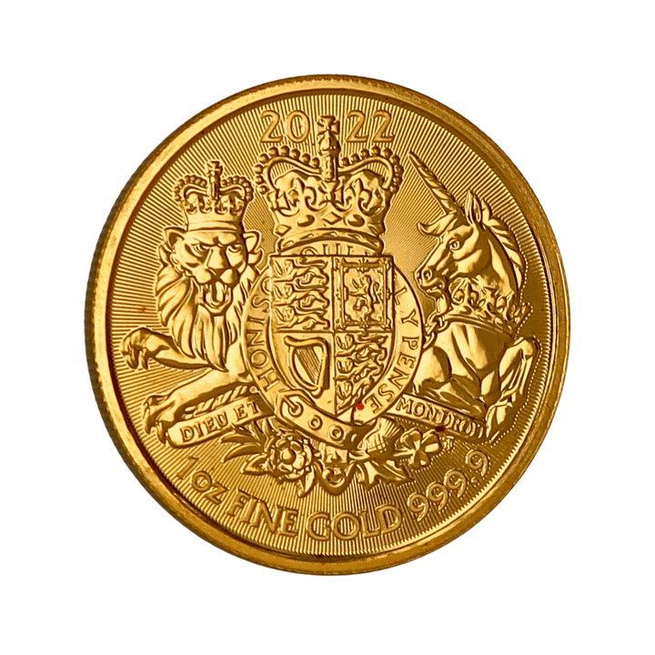 The Royal Arms, the official Coat of Arms of the reigning monarch, is featured on the reverse of this one-ounce fine gold bullion coin, with the monarch â„¢s portrait on the obverse. Originally displayed on shields and banners in medieval battles, The Royal Arms now stands out against radial lines, adding both beauty and security.