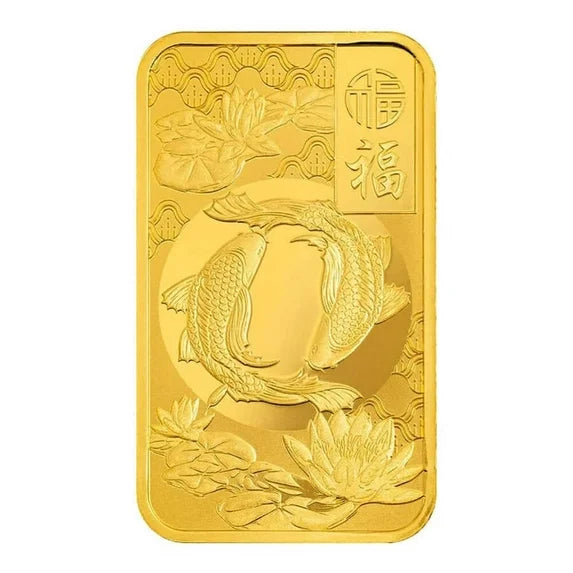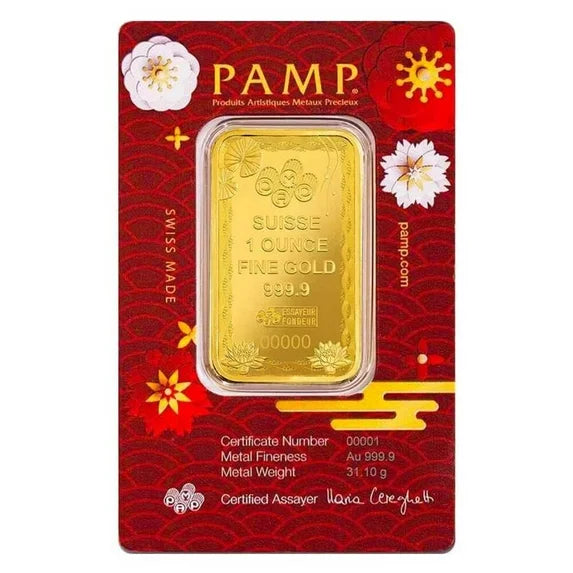 The front of the bar showcases a beautifully detailed motif inspired by symbols of good luck and positive energy, often featuring imagery like koi fish, dragons, or traditional patterns tied to wealth, harmony, and protection. The reverse includes the bar's weight, purity, unique serial number, and the official PAMP Suisse logo, certifying its authenticity and quality. Each bar is packaged in a tamper-evident CertiPAMPâ„¢ assay card, ensuring its weight and purity are fully guaranteed.