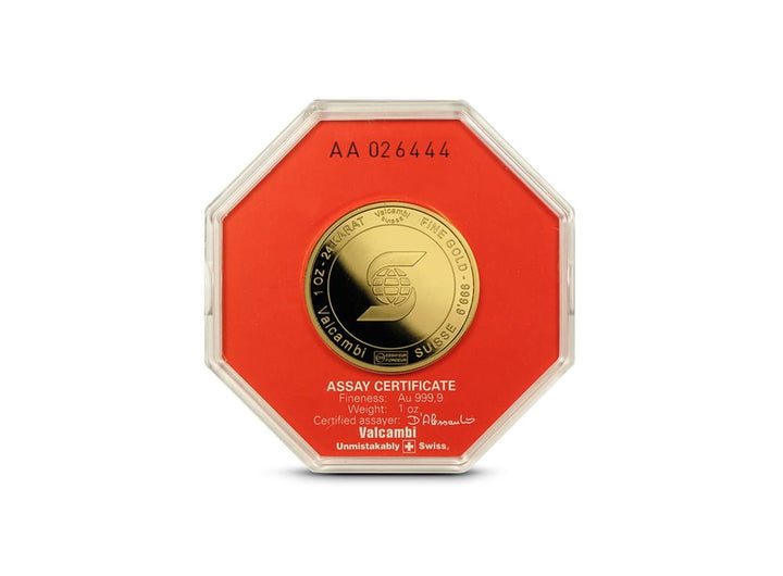 This 1 oz gold Scotiabank Round was designed by Valcambi, one of the world's most recognizable refineries. The names of both of these entities appear on the round as do the inscriptions for the fineness & the precious metal content. The round is of course shaped like a round object and it is encased in an octagonal plastic holder that includes the assayers signed certificate. Each individual round is unique and has a serial number embossed on the card to show this uniqueness. No two rounds will be exactly alike. The round has dimensions of 32 mm in diameter & 2.0 mm in thickness.