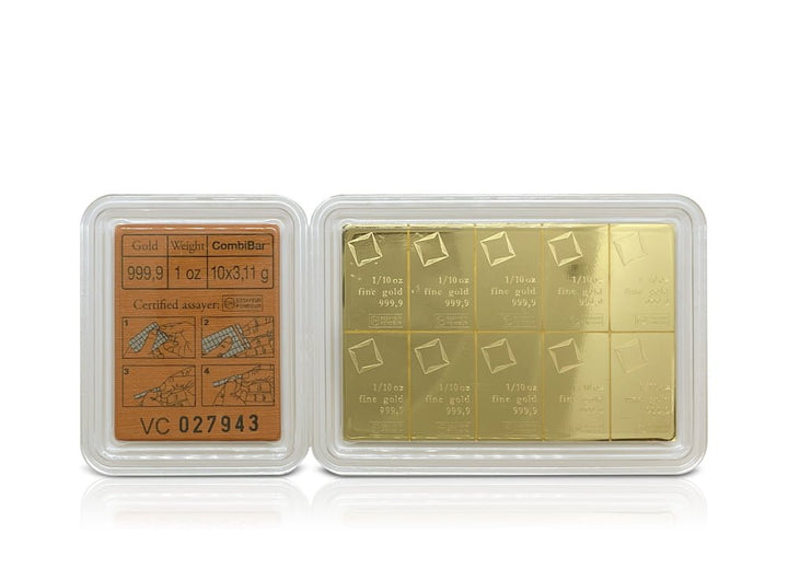The Valcambi brand is known for its craftsmanship, variety of sizes, and quality and the CombiBars offer an exceptional investment value and a practical one. Each 1 oz CombiBar is manufactured with accurate predetermined breaking points, making each smaller 1/10 oz increment in perfect condition and without any material loss and making it possible to sell only a portion of your 1 oz bar. This product is sealed and comes with an assay card to guarantee its originality.