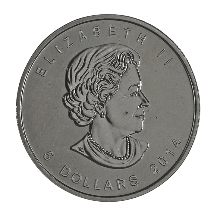The obverse showcases the effigy of Queen Elizabeth II, designed by Susanna Blunt, along with the coin â„¢s $5 CAD face value and the year of issue, 2014.