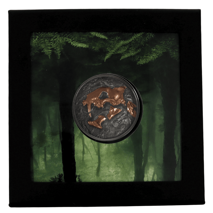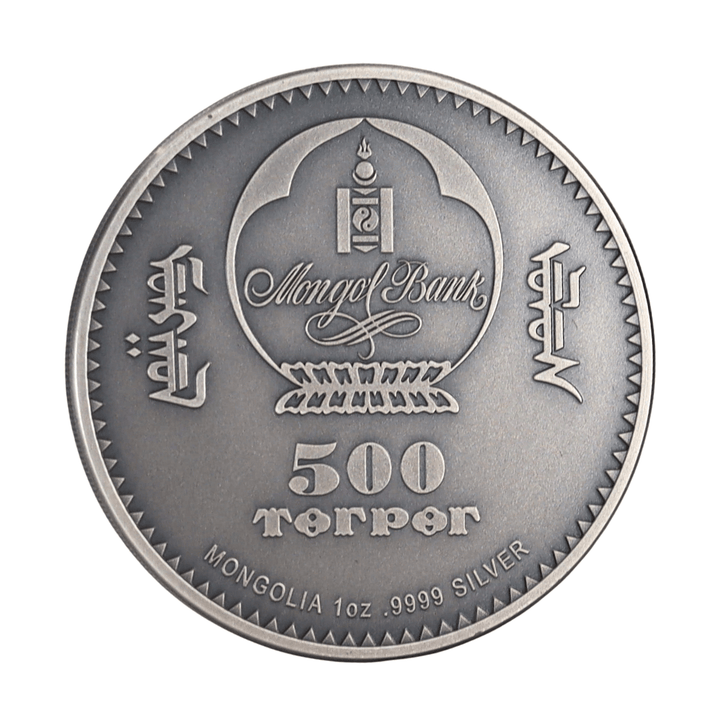 This 1 oz Silver 2023 Evolution of Life: Nimravidae 500 Togrog Mongolia coin boasts .999 fine silver purity and is issued by the Mongolian Bank. Minted in 2023, it features a captivating design depicting the Nimravidae, an extinct family of carnivorous mammals, showcasing the evolution of life on Earth. The reverse displays the Mongolian 500 Togrog denomination. This unique design and its historical significance contribute to its collectable value, making the 1 oz Silver 2023 Evolution of Life: Nimravidae 500 Togrog Mongolia a prized addition to any collection.