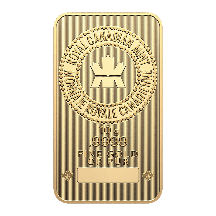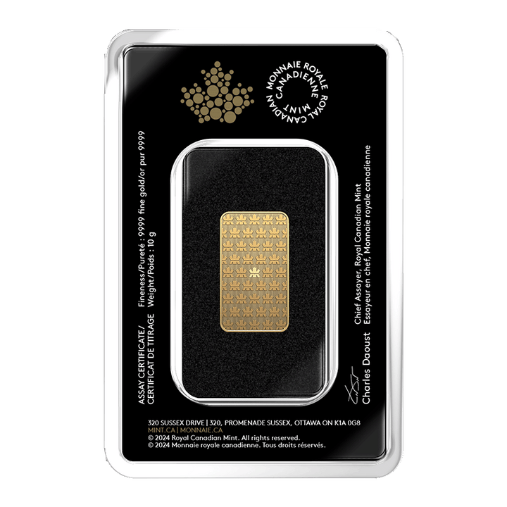 The 10 gram Royal Canadian Mint Gold Bar is a trusted investment piece, renowned for its quality and advanced security features. Produced by the Royal Canadian Mint, this bar offers a convenient way to invest in gold with a smaller weight.