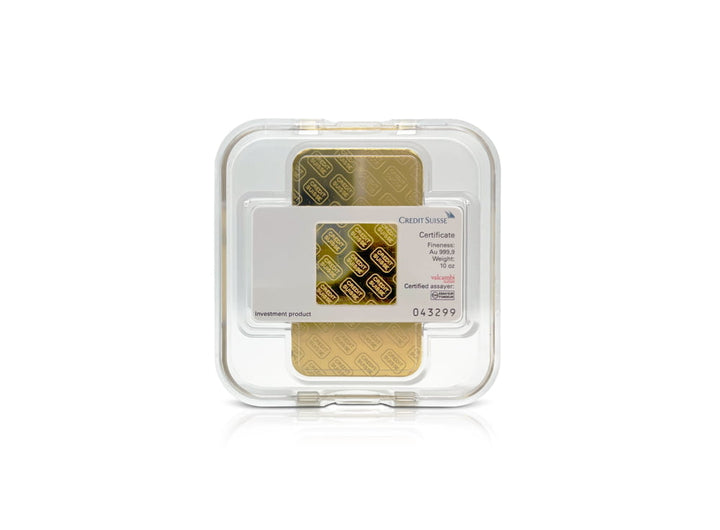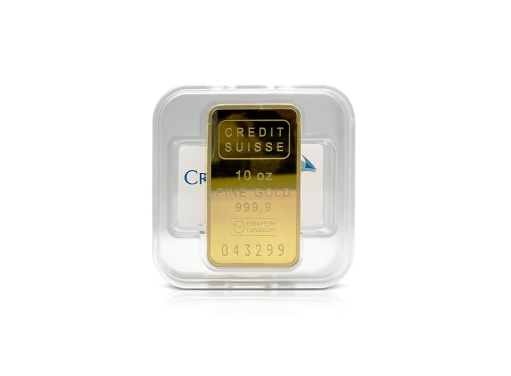 A trusted gold refiner, Credit Suisse, produced this 10 oz gold bar stamped with a unique serial number and accompanied by an assay card confirming the gold weight and purity.--- - - Credit Suisse is one of the world's leading refineries. It has been in Switzerland for over a century and is still going strong today. Now, Credit Suisse is held in high esteem by collectors and investors worldwide, and its 10 oz gold bar is one of the most sought-after products in the market.- - The front face of this gold bar has the rectangular Credit Suisse logo with the weight, purity, and metal content listed below it. An assayer ---s mark is also listed at the bottom of the bar, along with a unique serial number.- - On the back, ??it features a repeating image of the Credit Suisse logo set on a diagonal angle.--- - - The gold bar ---s sharp edges and refined appearance make it perfect for investors who want highly tradeable physical gold.- - Add this to your cart now!- - Express Gold Refining is an authorized dealer and can purchase directly from the most relevant brands. We pride ourselves on providing authentic products at competitive prices with your convenience and our integrity in mind.--- - - Look at some other Credit Suisse products we have in our inventory.- - * Photos may differ slightly from the products available.