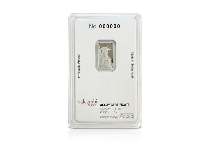 It features an image of the statue of liberty on the front. The bar's reverse contains the name, weight, fineness and a serial number of the bar. Each bar contains 2 grams of 99.95% pure investment-grade platinum bullion and comes sealed in its own plastic slip, with a certified confirming the authenticity and a serial number of the bar.