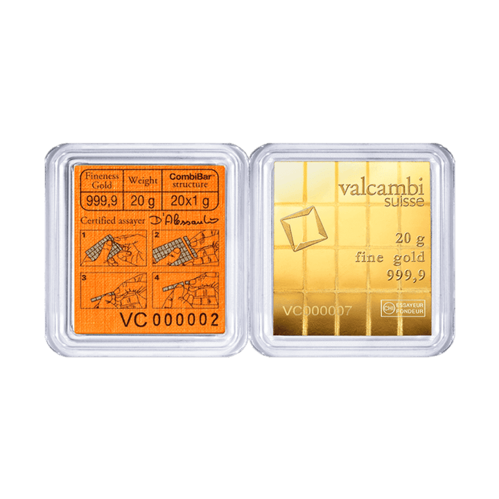 The Valcambi brand is known for its craftsmanship, variety of sizes, and quality and the CombiBars offer an exceptional investment value and a practical one. Each 20 g CombiBar is manufactured with accurate predetermined breaking points, making each smaller 1 g increment in perfect condition and without any material loss and making it possible to sell only a portion of your 20 g bar. This product is sealed and comes with an assay card to guarantee its originality.