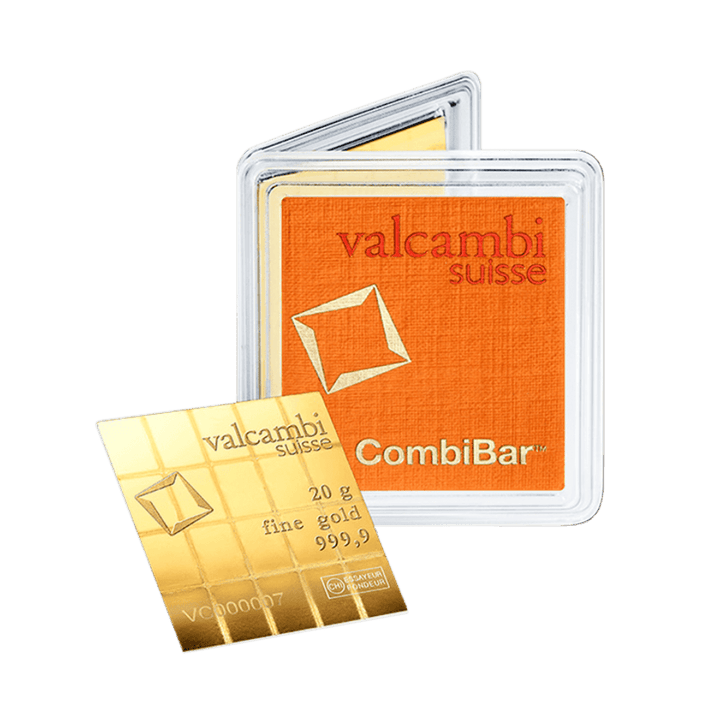 Add this 20 g Gold Valcambi Suisse CombiBar 9999 to your cart and increment your investment portfolio today!