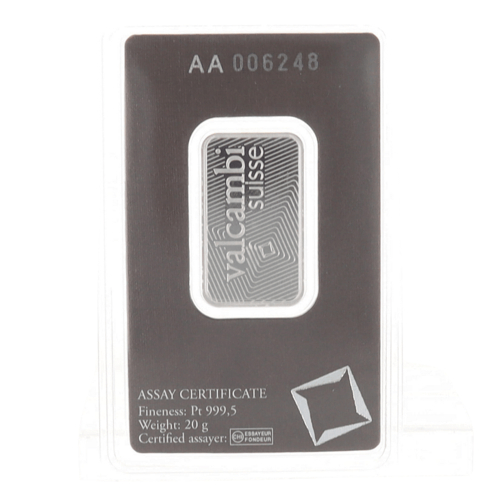 The 20 g Platinum Valcambi Suisse Bar is a high-quality investment piece, made from .9995 fine platinum. Weighing 20 grams, this bar features the Valcambi Suisse logo, weight, purity, and an individualized serial number on the obverse. The reverse showcases a radiating logo design. Each bar comes sealed in an assay card, ensuring its authenticity and quality