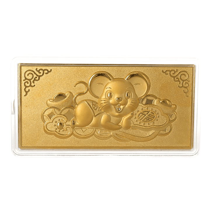 Celebrate the Chinese Zodiac â„¢s Year of the Mouse with this 200g gold plate, featuring .9999 fine gold and intricate mouse designs symbolizing intelligence and abundance. Perfect for collectors.