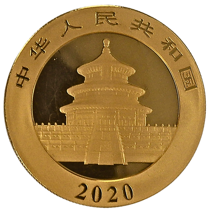 The Chinese Gold Panda is the flagship gold bullion coin of China, highly valued by investors worldwide. Crafted from 99.9% pure gold, the 30-gram coin is the largest in the Gold Panda series. Each year, the design changes, and in 2020, it depicts a panda chewing bamboo alongside its weight, purity, and 500 Yuan face value. The obverse showcases Beijing ™s Temple of Heaven, encircled by œPeople ™s Republic of China  in Chinese and the year 2020. Minted by Shenzhen Guobao Mint and fully backed by China ™s central bank, the People ™s Bank of China, the coin holds a strong guarantee from the Chinese State.
