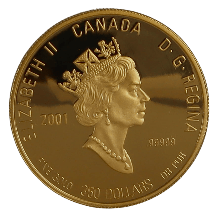 This 2001 $350 Provincial Floral Emblems Pure Gold Coin celebrates Nova Scotia's iconic Mayflower. The 99.999% pure gold coin weighs 35 grams (1.122 oz), has a proof finish, and has a low mintage of 1,988 pieces. Bonnie Ross's detailed depiction of the Mayflower, symbolizing hope and resilience as it blooms in spring, is on the reverse. Queen Elizabeth II is on the obverse. Part of the Provincial Floral Series, this coin is a treasured collectable for its rarity and purity.