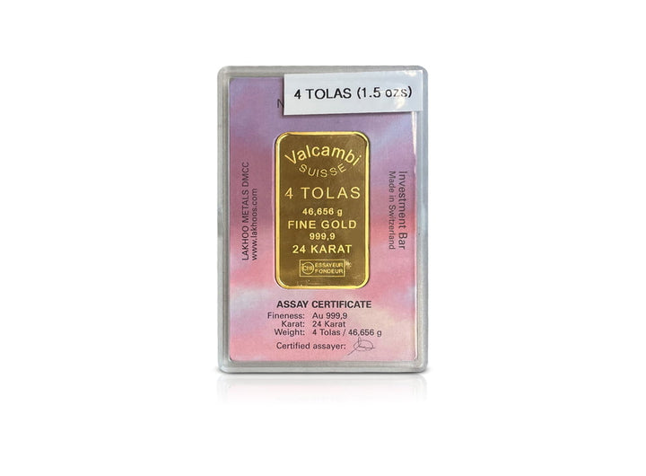 The 4 Tolas 24-karat Valcambi Suisse Boxed Bar is an investor ---s dream. Each unit portrays a delicate rose as a symbol of good fortune and a signature of authenticity from the legendary Swiss Assayer Valcambi.- - -- - - Express Gold Refining is an authorized dealer that only provides products from reputable and relevant brands.- - -- - - ABOUT VALCAMBI- - -- - - Valcambi is one of Switzerland ---s leading precious metals refineries, operating out of southern Switzerland in Balerna, and manufactures all precious metals bars for Credit Suisse. The company has been refining precious metals since the early 1960s. In addition to producing precious metals for banks, such as Credit Suisse, Valcambi also produces precious metals for industrial use.- - -- - - Valcambi also produces many gold and silver bars. Gold bars produced by Valcambi range in size from 1 gram to 1 kg, and silver bars from 1 Ounce to 1 Kilogram.- - -- - - Add 24 Karats of 999.9 Gold to your cart today.- - -- - - *Photos may differ from the products available.