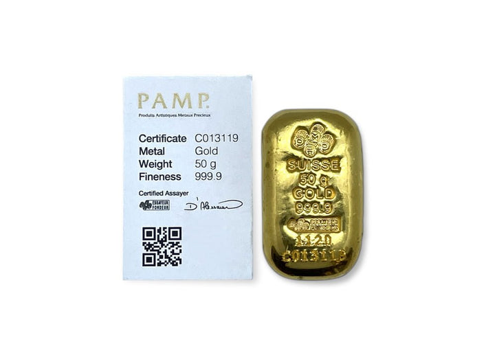 This casting 50 g (or 1,61oz) Gold Bar produced by PAMP Suisse is a great asset to your investment portfolio.- - PAMP Suisse is the world's leading independent refiner of precious metals, with international renown. With PAMP Suisse, you can also count on exceptional quality: all the gold used by the PAMP refinery is certified "LBMA Good Delivery," the highest and most prestigious certification on the market.- - Created in the heart of Europe in Switzerland, each gold bar comes with its serial number, which makes each gold ingot unique. This gold bullion is decorated with the famous PAMP seal: 4 circles, each containing a letter of the word PAMP. On the gold, bar is also mentioned its weight and purity. With 99.99% pure gold, this gold bar is perfect for all collectors, buyers, gold lovers, unique gift givers, or those who appreciate this simple and effective form of savings.- - Add this gold bar to your cart today!- - *Photos may differ from the products available.