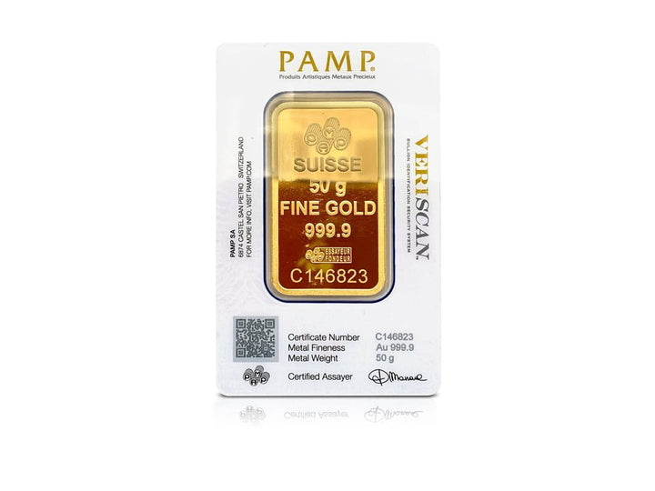 - The first decorative motif ever to embellish a precious metal bar, PAMP's distinctive Lady Fortuna design is famed the world over as assurance of PAMP quality and authenticity. Here, the Roman goddess of prosperity is portrayed with all of her mythical attributes: Sheaves of wheat, poppies, Horn of Plenty, precious coins, and Wheel of Fortune.- - Each bar contains 50 grams of 99.99% pure investment-grade gold bullion.- - These bars are produced by PAMP, one of Switzerland's most prominent refineries. The bars are part of the famous PAMP Fortuna series and feature the image of Lady Fortuna on the front. The reverse of the bar contains the name, fineness, weight, and the serial number of the bar.- - Each PAMP 50 gram Fortuna gold bar comes sealed in its own individual Certicard.- - The PAMP Fortuna series is available in gold, silver platinum, and palladium, and is a very popular option for precious metals investors worldwide.- - Add this 50 g Gold Pamp Suisse Bar 9999 to your investment portfolio today!- - *Photos may differ from the products available. People are viewing this right now