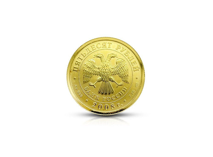 - Regarding its design, in the obverse, you can find features the Bank of Russia's emblem and a two-headed eagle with its wings down, under it is the inscription "BANK OF RUSSIA." Outside the circle of dots, across the top of the coin, are the words "FIFTY RUBLES." Along the bottom of the coin indicates the precious metal "Au" (gold) and the bullion coin's fineness "999." The year of issue is also along the bottom with the metal content "7.78" and the mintmark.